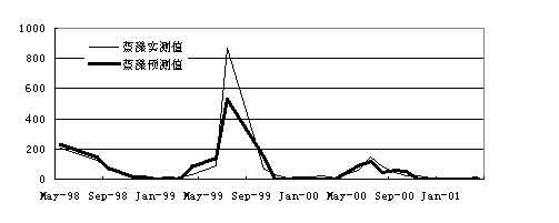 圖2千島湖藍(lán)藻密度平均值的實(shí)測(cè)值與預(yù)測(cè)值的比較