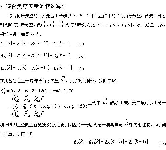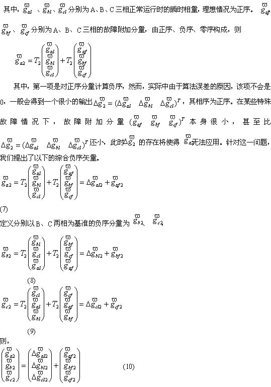 對于振蕩中的接地故障過渡電阻一般較大,220kV系統(tǒng)考慮100,500kV系統(tǒng)考慮300。伴隨著接地故障的出現(xiàn)必然有負序分量、零序分量。因此,負序分量與零序分量可以被用來識別振蕩中的接地故障[1]。該類原理存在的主要問題是如何在振蕩中準確、可靠地實現(xiàn)序分量的提取。振蕩中的系統(tǒng)頻率偏移50Hz,這對于基于50Hz采樣的保護裝置帶來一些問題。文獻[2]對于現(xiàn)有的負序算法在系統(tǒng)頻率偏移時的計算誤差進行了分析。快速的濾序算法[3]都是利用采樣序列實現(xiàn)相移的,當采樣序列不再是50Hz的同步采樣時負序的計算將有很大的虛假的輸出。只有在實現(xiàn)頻率跟蹤后,得到的負序輸出才是真實的。目前,國內(nèi)外的線路保護裝置基本上都不在硬件上實現(xiàn)對系統(tǒng)頻率的跟蹤采樣,有一些保護在軟件上采取了頻率跟蹤采樣,但頻率跟蹤都有較長的響應時間,一般用于遙測量的計算。本章從序分量的準確提取入手,提出一種基于空間變換的綜合負序矢量,該特征量具有不受系統(tǒng)頻率偏移的影響,對于反映在振蕩過程中由于不對稱故障產(chǎn)生的負序分量具有很高的靈敏度,與零序分量相配合能夠識別出振蕩中的高阻接地。