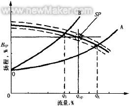 2)以泵流量核查儀表流量:運(yùn)行職員如對(duì)流量?jī)x表產(chǎn)生懷疑,往往與泵銘牌上“規(guī)定性能點(diǎn)”的額定流量(見圖2之qsp)進(jìn)行比較,或與泵典型揚(yáng)程 流量特性曲線的流量讀數(shù)進(jìn)行比較,如不一致即以為儀表不正確,這顯然是一種誤解。泵的輸送流量是泵的特性曲線和管道系統(tǒng)負(fù)載特性曲線(圖2之OA與OB)交匯點(diǎn)所確定的qA與qB,它隨著運(yùn)行負(fù)載而變。而泵銘牌上的額定流量是在某一規(guī)定條件下的流量,在大部分情況下是不會(huì)一致的。此外泵的額定流量也規(guī)定答應(yīng)有4%~8%的答應(yīng)誤差(按泵的等級(jí)而定),同一規(guī)格各臺(tái)泵的揚(yáng)程 流量特性曲線也有差異(在圖2兩虛線范圍內(nèi)),輸出流量也是不一樣的。即便是泵的實(shí)測(cè)揚(yáng)程 流量特性,流量值也可能有2%~3 5%的誤差[6]。因此不能用泵的流量值來作為判別流量?jī)x表正確與否的依據(jù)。但日常運(yùn)行時(shí)可相互參照,若兩值出現(xiàn)與日常運(yùn)行的差值有異常變動(dòng)時(shí),應(yīng)作為“故障跡象”檢查泵、儀表和管道系統(tǒng)。