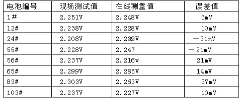 萬(wàn)用表蓄電池直流電壓檔丈量精度為0.7%以上,盡大多數(shù)蓄電池在線裝置產(chǎn)品說(shuō)明書(shū)上提到的丈量精度達(dá)到了0.5%以上;顯示丈量數(shù)值有些蓄電池在線裝置的丈量端電壓數(shù)值為小數(shù)點(diǎn)后2位,與規(guī)程要求有較大誤差;有些裝置丈量值雖可以到小數(shù)點(diǎn)后3位,但與實(shí)際用表丈量數(shù)值相差較大。從運(yùn)行情況看,端電壓在線監(jiān)測(cè)的誤差是隨機(jī),每個(gè)數(shù)值偏差都不一致,而且偏差值隨著環(huán)境溫度、浮充電壓變化等而變化。表1為現(xiàn)場(chǎng)任意抽查幾個(gè)蓄電池浮充電壓,現(xiàn)場(chǎng)測(cè)試值與在線丈量值的誤差情況,現(xiàn)場(chǎng)測(cè)試采用FLUK111數(shù)值