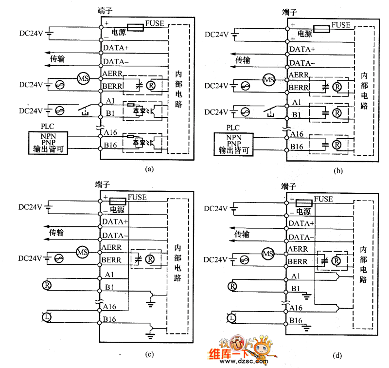 。╟)輸出模組(NPN);(d)輸出模組(PNP)
