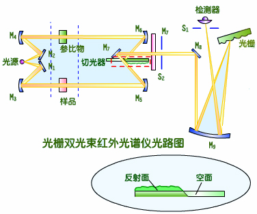 記錄式光柵紅外光譜儀,多采用雙光束光學(xué)自動(dòng)平衡原理。具體原理為:由光源S發(fā)出的兩束光經(jīng)兩對(duì)對(duì)稱的反射鏡M1M2和M3M4獲得兩束強(qiáng)度相同的平行光束,分別通過(guò)樣品池和參比池,兩束光經(jīng)M5和M6反射鏡改變方向。