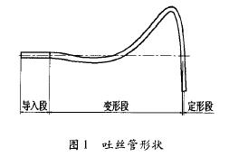 吐絲機的作用是將線材通過安裝在吐絲盤上的吐絲管,使其受各種力的綜合作用下進行塑性變形,線材由直件向盤卷進行轉(zhuǎn)化。吐絲管形狀如圖1,吐絲管可根據(jù)其作用不同可分為三個部分: