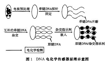 傳感器是由固定了DNA的電極和電化學(xué)識(shí)別物質(zhì)組成。固定在電極表面的DNA起著選擇性識(shí)別特異靶基因的作用。根據(jù)雜交指示劑的電化學(xué)信號可以測得靶基因是否存在和含量多少。因此,DNA 在電極表面的固定是DNA電化學(xué)