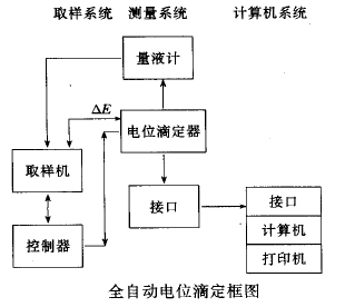 滴定儀至少包括兩個(gè)單元,即更換樣品系統(tǒng)和測量系統(tǒng),測量系統(tǒng)中包括自動(dòng)加試劑的部分,以及數(shù)據(jù)處理部分。儀器的結(jié)構(gòu)框圖見下圖。